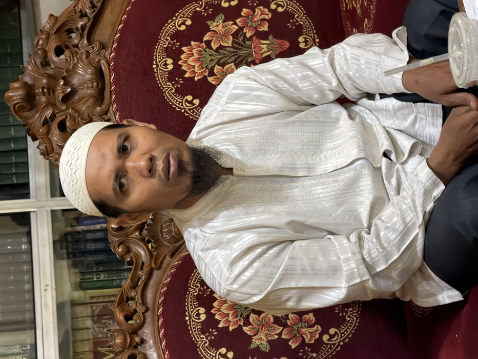 A man wearing a white kufi and a patterned white shirt sits on an ornate red chair with floral details. His beard is short and dark. He looks towards the camera with a serious expression. To his right, another person holds a clear plastic cup with a straw. In the background, a bookshelf is visible.