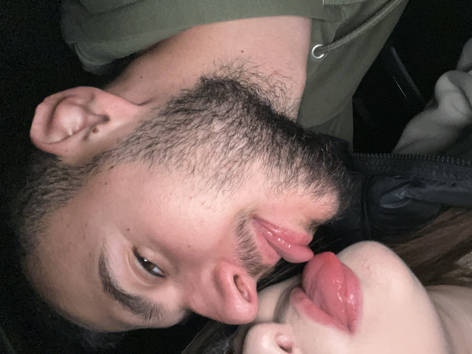 A close-up, rotated view of two individuals, seemingly in an intimate moment involving their tongues. The individual on the left has facial hair and is wearing a dark green hooded jacket. No location information related to Plovdiv, Bulgaria is evident in the provided image.