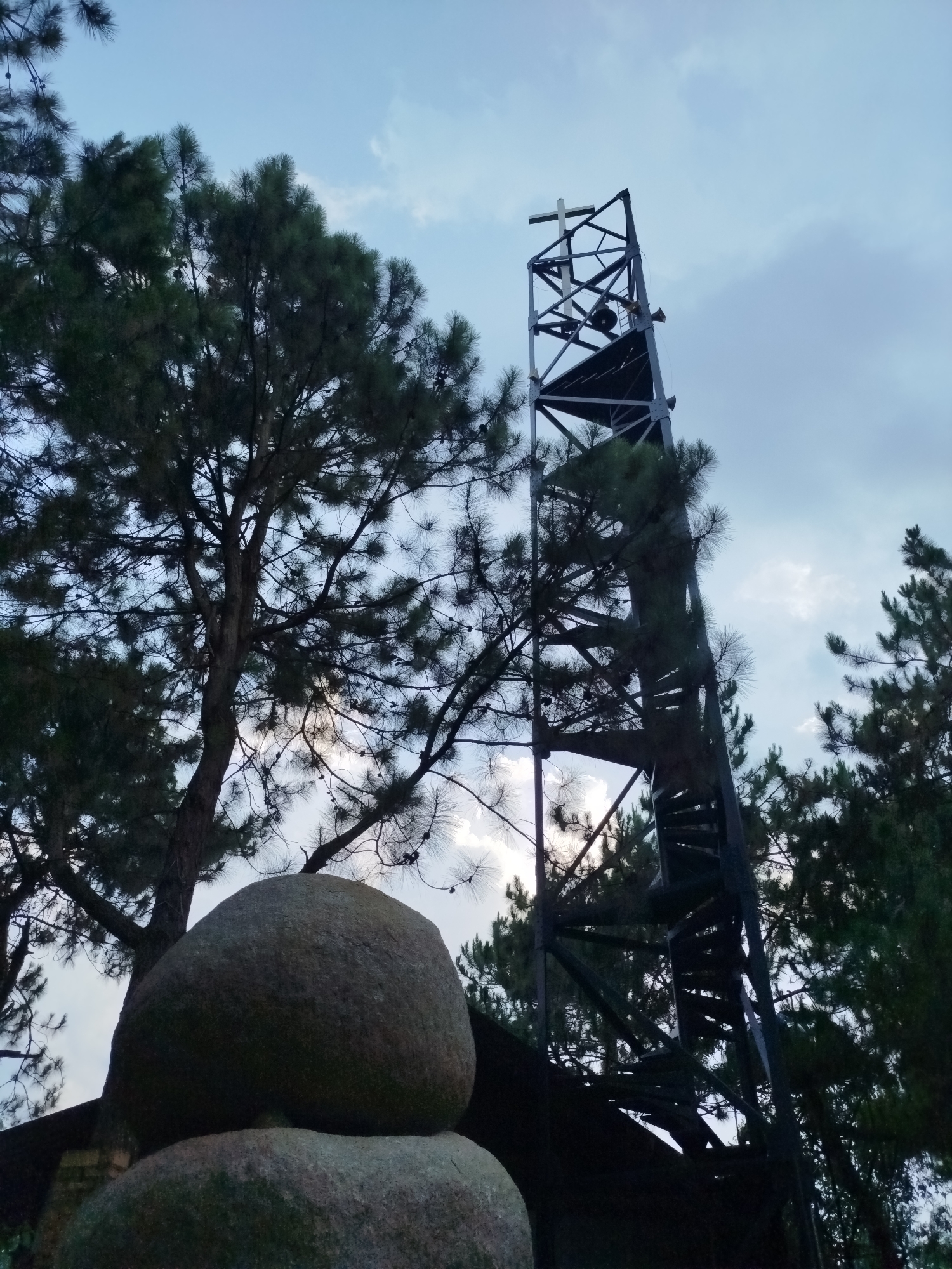 low-angle view of a landscape with natural and man-made elements. In the foreground, two stacked, large, rounded rocks are prominent. Behind and to the left, a pine tree rises, its branches extending towards the sky. To the right of the tree, a tall, dark metal tower structure stands, appearing to have a platform with a cross at the top. Another pine tree is positioned to the right of the tower. The sky is partially cloudy and visible between the trees and structures. The location is presumably Krăng Chớ, Vietnam.