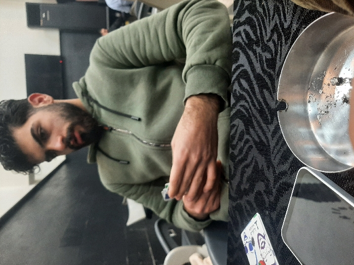 - "A man with dark hair and a beard, wearing a green hoodie, sits near a table" by FM-J2D4h2, licensed under CC BY 4.0