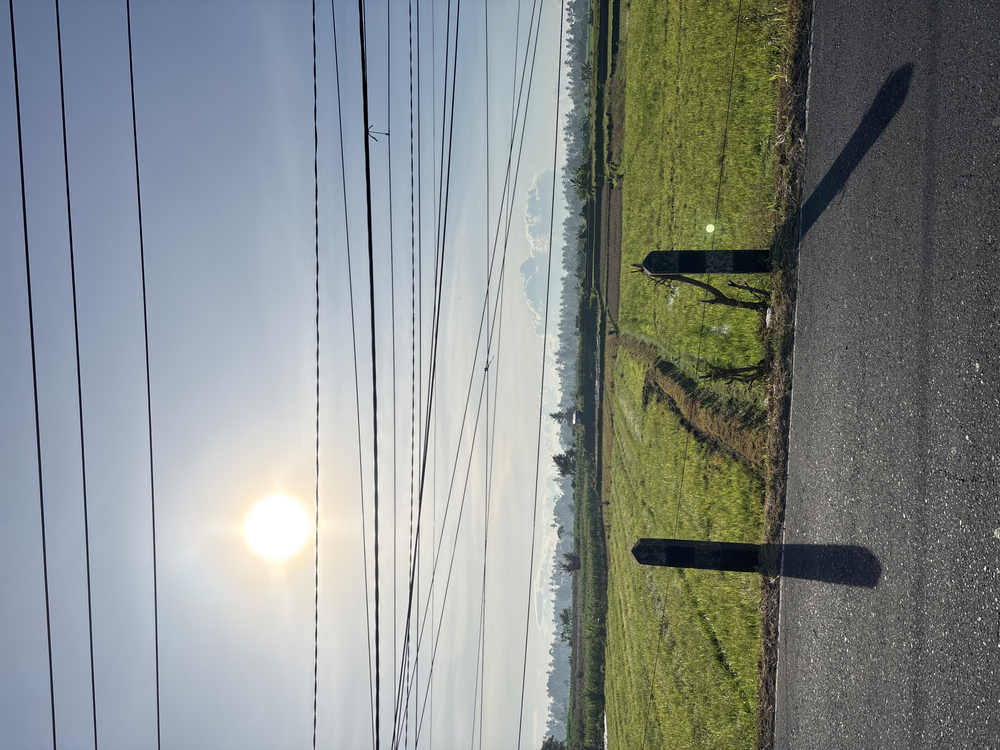 The image depicts a rural roadside scene in Abiansemal, Indonesia. The sun is low in the sky, shining through a network of overhead power lines that run across the upper left portion of the frame. Beyond the power lines, a clear blue sky transitions into a horizon line where the green rice paddies and distant palm trees meet the sky. The green rice paddies stretch along the right side of the frame, separated from the asphalt road by a low concrete post, casting a long shadow onto the pavement. The surface of the road is gray. The overall composition suggests a quiet, sunny morning in a countryside setting.