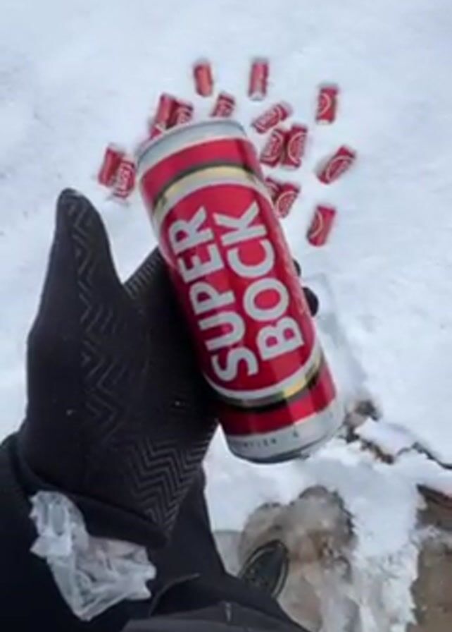 person standing in the snow, surrounded by numerous empty red and silver cans of Super Bock beer