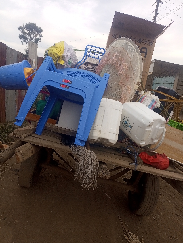 The image depicts a wooden handcart, heavily loaded with diverse household items, positioned on a dirt path in Kiamaina ward, Kenya. The sky overhead is overcast. **Forensic Description:** The primary subject is a rustic wooden handcart with two visible wheels, resting on dry, brown dirt ground. The cart is overladen with an assortment of objects. Prominently featured in the center-left is an inverted blue plastic stackable chair. To its immediate left, a blue plastic bucket containing yellow fabric or clothing hangs from the cart's side. A long, grey string mop head dangles from the front wooden beam of the cart. On the right side of the cart bed, two white plastic jerrycans or containers are visible, with one displaying blue label text. A single red plastic sandal or shoe rests on the cart bed near the right wheel. Towards the rear and right, a large, open brown cardboard box with white shipping symbols stands upright, leaning against other items. A circular object with a white and pink patterned lace or netting cover is visible leaning against the cardboard box. Additional items, including other blue plastic chairs, bundles wrapped in fabric (one notably yellow), and an indistinguishable white rectangular object, are stacked and packed onto the cart. The background on the left features a weathered, rusted corrugated metal fence. Behind this, a slender utility pole with an attached tree is visible. On the right side of the background, part of a masonry building with a dark-framed window or door opening is present. No individuals are visible within the frame. The overall scene suggests a collection of personal effects either being transported or temporarily stored.