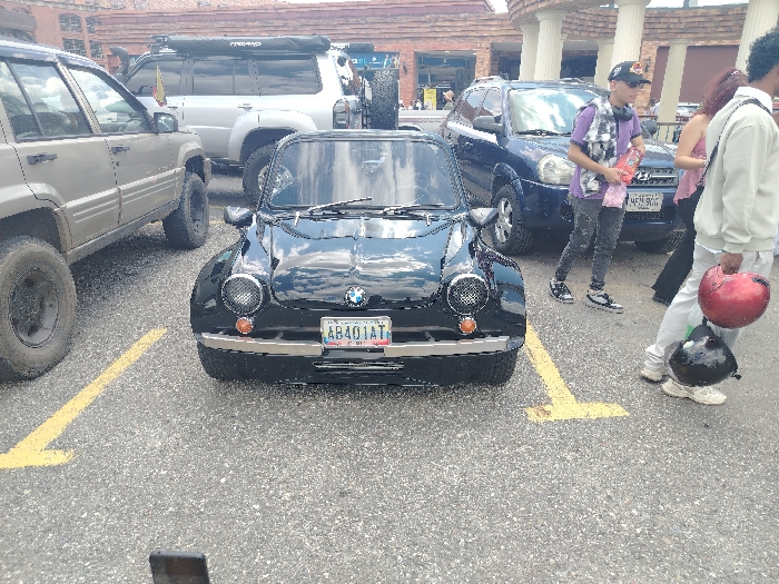 The image depicts an outdoor parking lot scene in Carrizal, Venezuela, featuring several vehicles and pedestrians under an overcast sky. In the foreground, a glossy black, small, two-door vehicle with a distinctive bulbous front design and a prominent BMW emblem on its hood is centrally parked within a yellow-lined space. Its Venezuelan license plate reads "AB401AT". To the immediate left, the front section of a light tan SUV with large off-road tires and lifted suspension is visible. In the background-left, a silver SUV equipped with a roof rack and an awning, with a spare tire mounted on the rear, is parked. Behind the black car, a dark blue Hyundai Tucson SUV is parked, displaying a partial Venezuelan license plate "HEW 90G". Three individuals are present on the right side of the frame. One male, wearing a black baseball cap, a purple t-shirt with a graphic print, a black and white patterned scarf, black ripped jeans, and black and white sneakers, walks rightward while holding a red and white packaged item. Adjacent to him, a second male, clad in a light-colored hoodie and pants with white sneakers, carries a red motorcycle helmet in his right hand and a black motorcycle helmet in his left hand. A third, partially visible female figure in a pink top is positioned behind the second male. The background features a building with a reddish-brown facade and prominent white support columns, indicative of a commercial establishment.