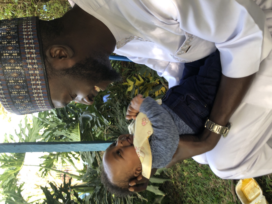 This image, set outdoors in the city of Unknown, Nigeria, depicts one adult male interacting with one infant
