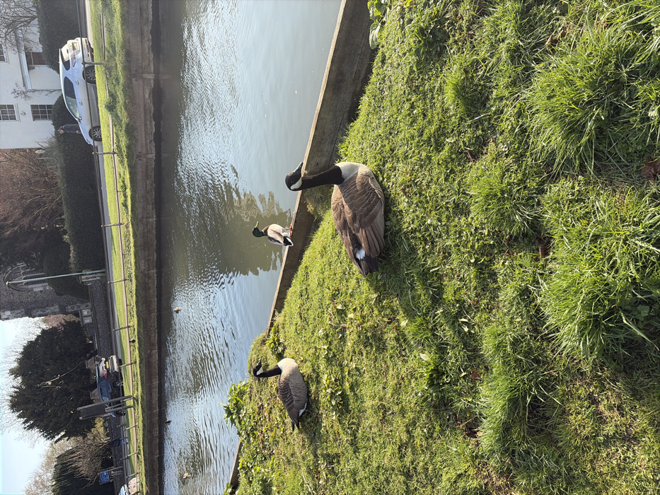 The image presents a sunny daytime scene on the grassy bank of the New River Loop in Broxbourne, United Kingdom, adjacent to High Road. In the foreground, two Canada Geese are positioned on lush green grass; one lies centrally, facing right with its head up, while the second is further left, also resting facing right. A wooden retaining wall marks the transition from the grass to the water. A male Mallard duck stands on this wooden edge, near the central goose, facing left towards the water. The calm water reflects the clear blue sky and ambient light. Beyond the water, a paved road is visible, featuring a silver hatchback car parked or moving slowly on the left, and a dark SUV further back, both facing left. A pedestrian is discernible near the silver car. On the far left, a prominent grey stone church, identified as St. Augustine's Church, with a tall spire, stands among trees. To the right, a two-story white building with multiple windows is visible. The background consists of various trees, some bare deciduous and others evergreen, along with hedges lining the road and properties. The scene is illuminated by strong sunlight, casting visible shadows.