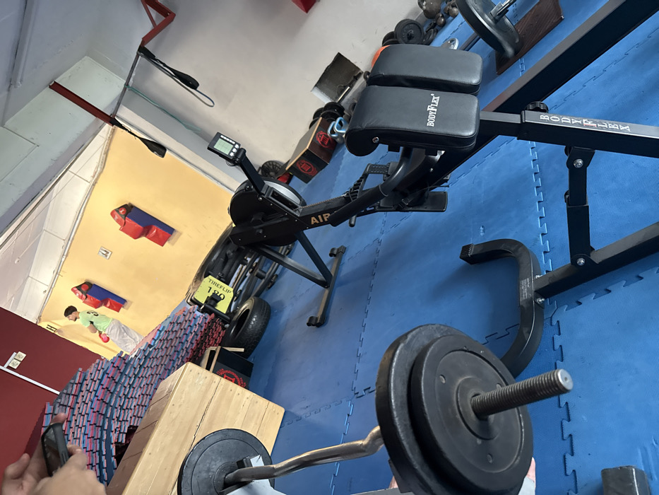 The image depicts the interior of a gym or fitness facility. The floor is covered with blue interlocking foam mats. In the foreground, a person's hand holds a black smartphone, taking the photograph. To the left, an EZ curl barbell with two black weight plates rests on the blue mat. Behind it, a light-colored wooden plyometric box is visible, and further back, a wall is covered with a large quantity of stacked, colorful (pink, blue, and black) square mats or pads. In the midground, a black "AIR ROW" rowing machine with a digital display screen is positioned. To its right, a black "BODYFLEX" hyperextension bench or Roman chair is visible, featuring two black padded cushions. Partially obscured behind the rowing machine is a black truck tire and a black frame with a yellow sign that reads "THE FLIP 180". In the background, a person wearing a light green t-shirt and light-colored pants stands facing a yellow wall. This individual has a red object, possibly a boxing glove or hand wrap, on their left hand. Mounted on the yellow wall are two red and blue punching pads. The ceiling is white, and structural elements appear in red. The specific location within the city of Sofia, Bulgaria, cannot be determined from the visual information provided in the image.