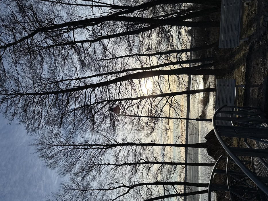 This outdoor image depicts a coastal park scene in Vaasa, Finland, at an unspecified time of day, characterized by low sun illumination. The foreground features the metal railing and mesh surface of a pedestrian bridge on the left. In the midground, a dark-colored street lamp with a conical top stands centrally, positioned between multiple bare deciduous trees that form dark silhouettes against the sky and water. The sun is visible in the center-right, partially obscured by tree branches, creating a strong backlight and reflection on the water's surface. The body of water, likely a sea or large lake, shows patches of ice. Two light-colored wooden park benches are situated on the right side of the frame, positioned on a patch of ground. The sky above is light blue with subtle cloud formations. No individuals, activities, or interactions are present in the scene.