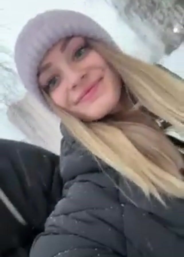 A young woman wearing a lilac beanie and a black puffer jacket is recording a video on what appears to be a snowy day
