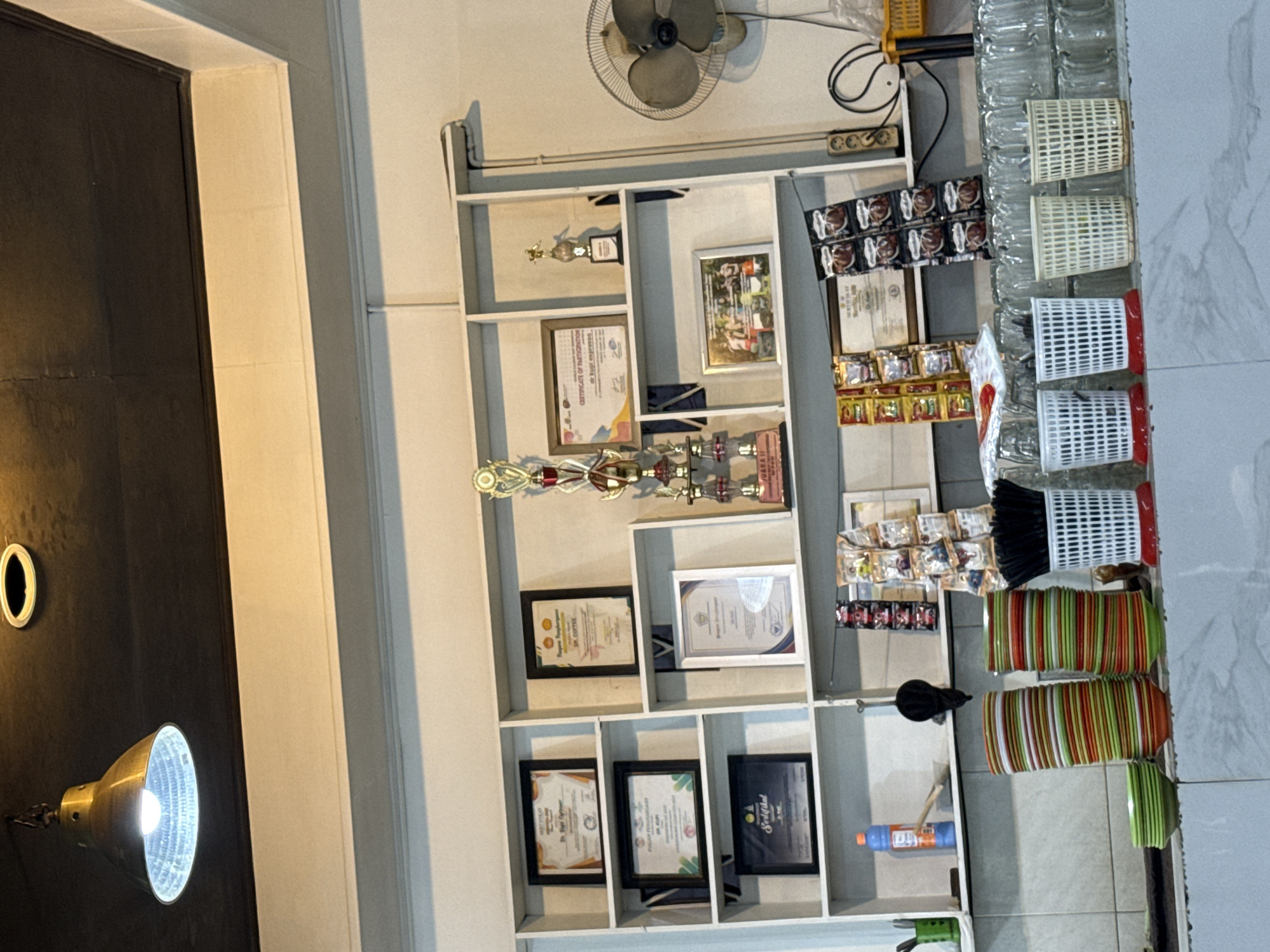 This image depicts the interior of a commercial establishment, likely a cafe or small restaurant, in Lhokseumawe, Indonesia. The ceiling is dark-colored, featuring an illuminated brass-toned industrial pendant lamp and a recessed circular light. White walls support a multi-compartment shelving unit displaying various items. On the shelves, multiple framed certificates and awards are visible; some feature Indonesian text such as "Sertifikat" and "Piagam Penghargaan," with specific mentions of "Dr. Kopi." A tall gold-colored trophy stands prominently in the center, flanked by several smaller trophies. A framed photograph depicting a group of people is positioned on the middle-right shelf. Small packaged goods, likely sachets of beverages or food items, are displayed on the lower shelves and at counter level. A blue spray bottle and a dark utensil hang on the left side of the lowest shelf. To the far right, an off-white wall-mounted oscillating fan, an electrical power strip, and associated black wiring are visible. The foreground features a light-colored counter surface with a subtle marbled or tiled pattern. On this counter, from left to right, are several tall stacks of colorful plastic plates (green, orange, red, and white). Next to them are three white perforated plastic containers with red bases, holding black plastic straws. To their right are three older, off-white perforated plastic containers, and a large quantity of clear glass cups stacked in multiple rows. No individuals or explicit actions are depicted in the scene.
