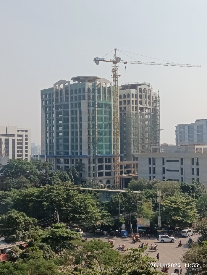 Two tall buildings under construction dominate the skyline, one partially covered in green netting, with a large crane positioned behind them. In the foreground, lush green trees obscure much of the street scene below, where various vehicles and pedestrians are visible. The sky is hazy and bright, casting a soft light on the scene. The date, 26/11/2025, and the time, 11:55, are imprinted on the bottom right corner of the image.