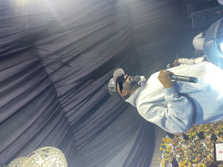 A singer in a light gray hooded sweatshirt, dark sunglasses, and a backward baseball cap holds a microphone on stage. Behind him is a dark, draped curtain. To the lower left, a round, decorated object is visible. To the lower right, flowers and a sign with a circular logo are present. The image is shot at an angle, as if from a lower position looking up.