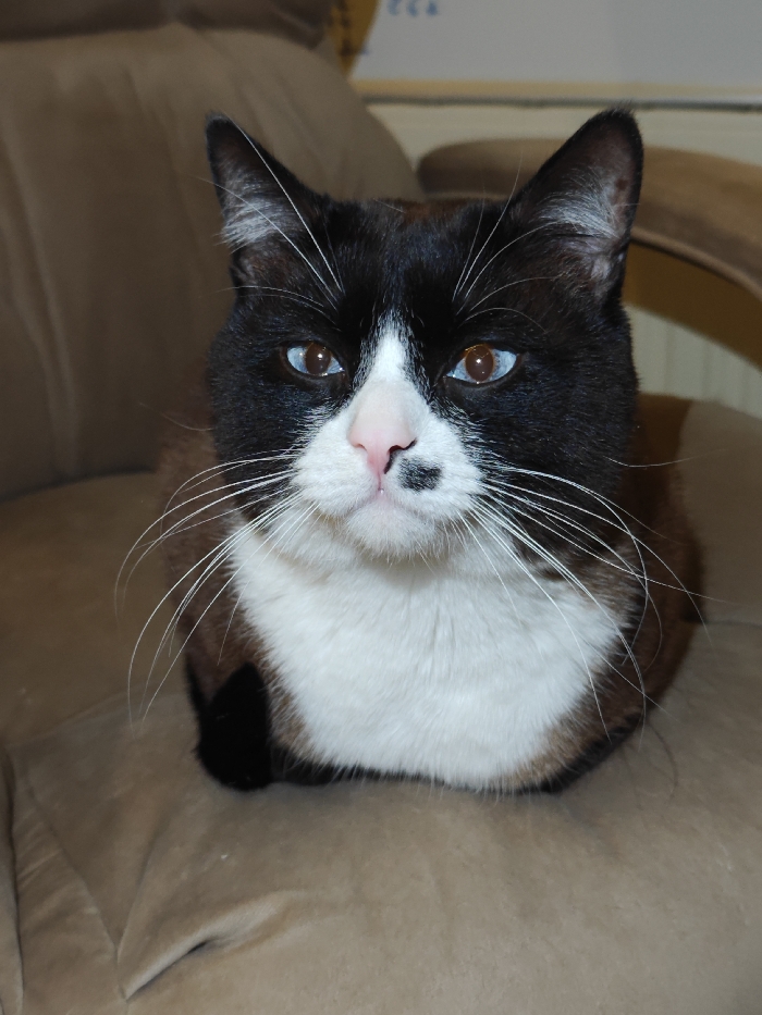 - "A captivating close-up showcases a striking black and white cat with mesmerizing blue eyes" by FM-eMutn2, licensed under CC BY 4.0