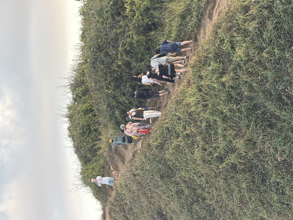 A group of people are walking along a narrow, dirt path on a hillside. The vegetation is dense and green on either side of the path, with a mix of bushes and grass. One person at the front appears to be taking a photo with a phone. The sky is overcast. The group is diverse in age and attire, including casual clothing and backpacks.