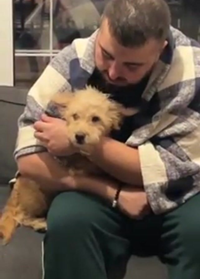 A man with a beard and wearing a plaid shirt and green pants is sitting on a grey couch and hugging a small, tan, fluffy dog. The man is looking down at the dog and appears to be petting it. The dog is looking forward and appears calm. In the background, there is a window with reflections of furniture and people. Music is playing in the background.