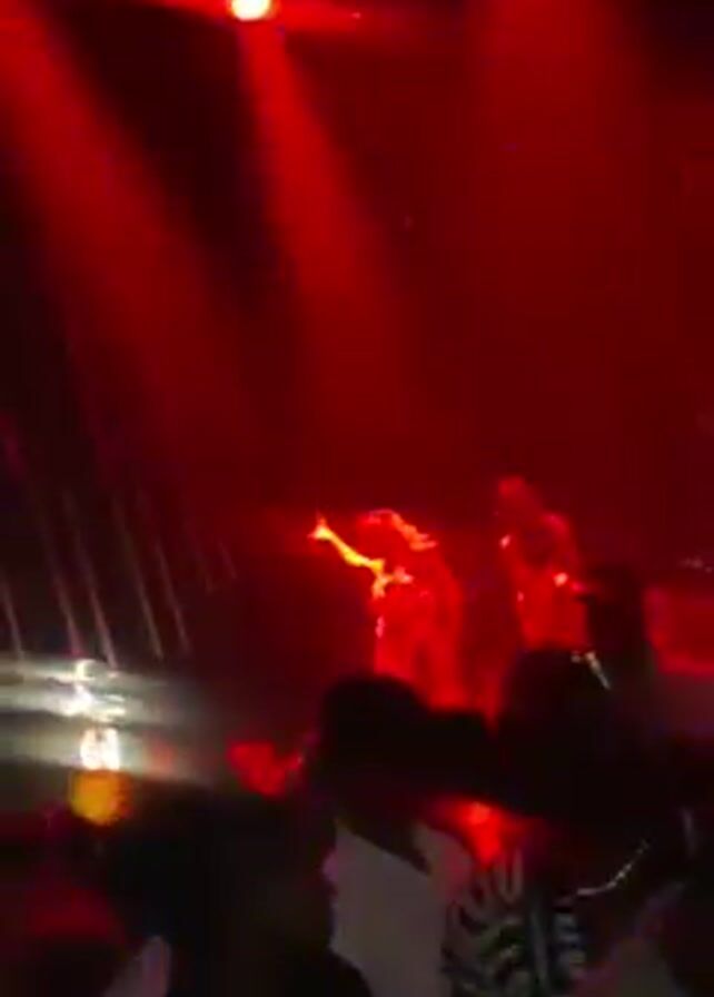 nightclub or concert with many people. The stage is lit with bright red and blue lights, and there are white vertical LED panels behind the stage. It is difficult to identify individuals because of the darkness and the low quality of the video. People in the crowd are obscured and appear to be moving to the music.