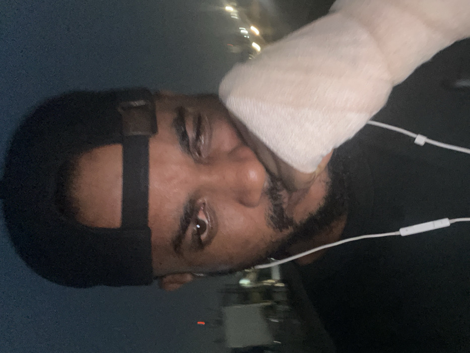 A man is seen in a close-up shot with a bandage covering part of his face. He's wearing a black head covering with a strap across the top. White earphones are visible. The background suggests an outdoor setting, possibly at night, with soft lighting. His expression appears somber, and the focus is on his face.