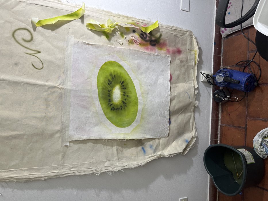The image displays an indoor workspace, likely an art studio. No individuals are present. A large, off-white fabric sheet, appearing worn with frayed edges and various paint stains (blue, yellow, pink), is affixed to a white wall. Centered on this larger fabric, a smaller white textile piece exhibits an airbrushed or stenciled depiction of a cross-section of a kiwi fruit, rendered in shades of green with a central white core and dark seeds, surrounded by a faint yellow aura. Above the kiwi artwork, a dark green calligraphic 'N' or swirl is visible on the background fabric. To the right of the kiwi, strips of yellow material are taped to the fabric, below which are splashes of pink and dark green paint. The floor is covered with terracotta-colored tiles, showing minor paint splatters. On the floor, a dark heart-shaped bucket contains a murky greenish liquid with an object partially submerged. Adjacent to the bucket, a blue electric airbrush compressor is connected via a hose to a metal airbrush gun and plugged into a wall outlet. A crumpled, stained cloth lies near the bucket, and a partial view of a black stand or chair base and a white open container are visible on the right. The specific location within Buenos Aires, Argentina, cannot be determined from the provided visual information.
