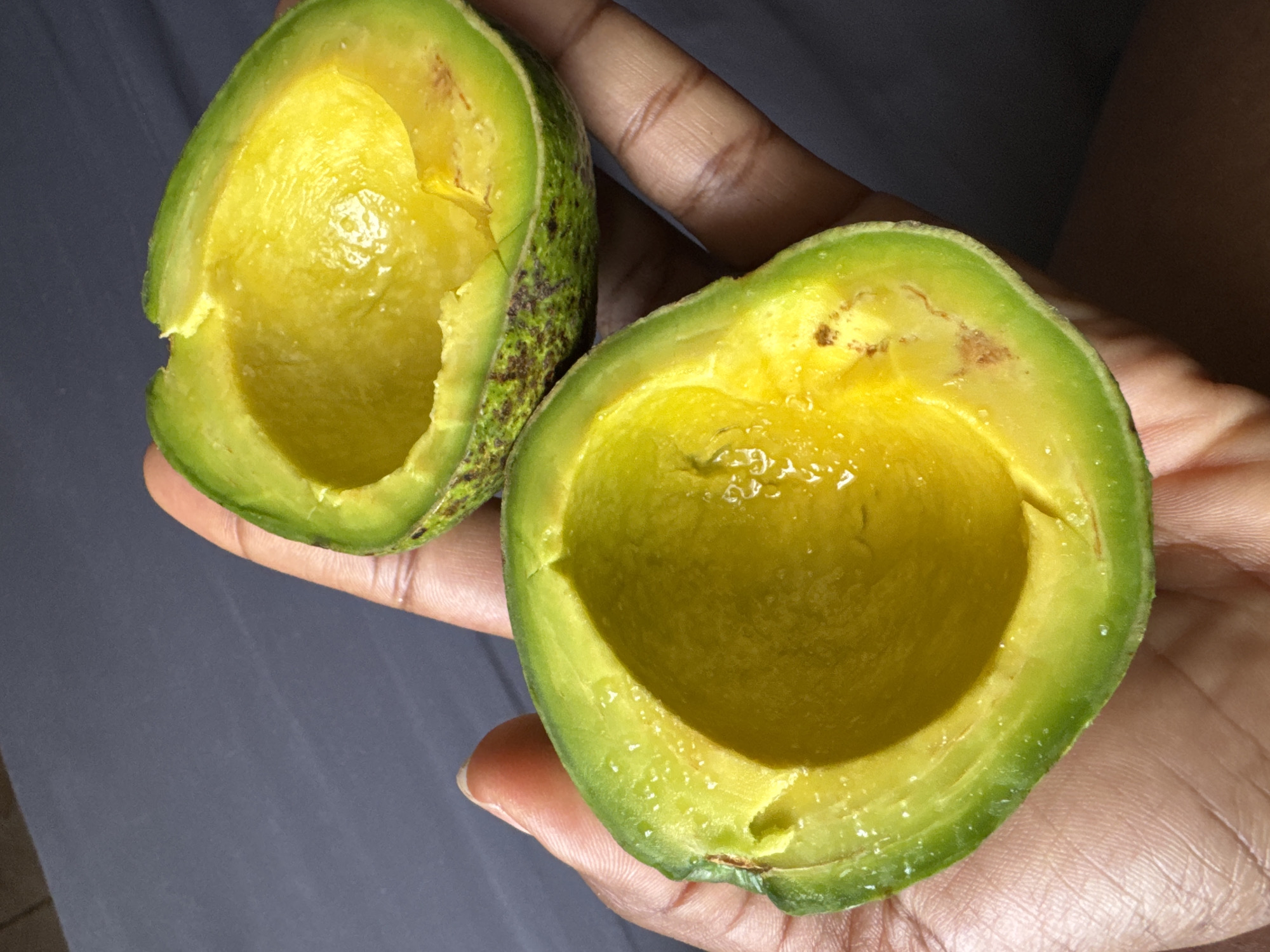 An individual holds two halves of a ripe avocado in their palm. The avocado has a vibrant green outer skin and a yellowish-green inner flesh, with the pit removed. The background appears to be a dark, possibly gray, fabric surface. No information in the image indicates the location is in Lekki, Nigeria.