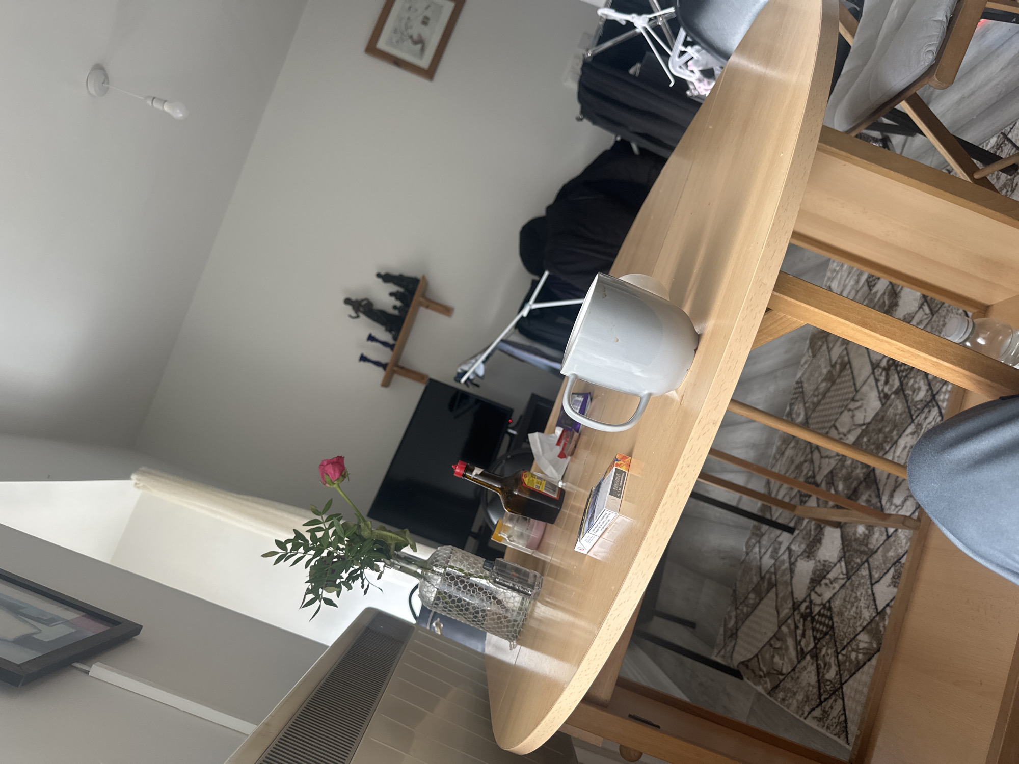 The image depicts an interior domestic scene. The primary subject is a light-colored wooden oval table, viewed from a low angle, consistent with a person seated at it, whose leg and lap, clad in dark grey fabric, are visible in the lower left foreground. A white plastic water bottle rests on a lower shelf of the table's base. On the tabletop, from right to left: a light grey ceramic mug with a handle facing right; a partially used pack of "Marlboro Red" cigarettes displaying a health warning in English; a small white packet of tissues; a dark brown glass bottle with a red cap; a small clear cylindrical object; and a clear glass vase with a textured pattern containing green foliage and a single vibrant pink rose. In the midground, behind the table, a dark flat-screen television is visible on a stand. To the right of the television, a white metal clothes drying rack is draped with several dark articles of clothing, primarily jackets or coats. A dark chair with a light-colored cushion is partially visible to the far right of the table. A wooden floating shelf on the white wall above the television holds several dark decorative items, including two blue vase-like objects and multiple figurines. The room features plain white walls and a white ceiling from which a single bare lightbulb hangs by a white cord. To the left, a window with a white radiator beneath it is visible, along with a white curtain. A framed picture hangs on the wall above the radiator. The floor beneath the table is covered by a rectangular rug with a geometric pattern in shades of brown, beige, and black. The scene is static, with no active individuals or interactions depicted. No external geographical markers are present within the image to identify the specific location as Cashel, Ireland, or any other city.