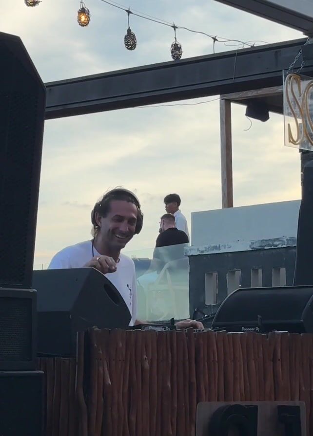 A man wearing headphones and a white shirt smiles while using a DJ mixer, which is behind a decorative wooden wall. The words "SOL" and "FRIDAYS" hang above. Several other people are visible in the background on a higher level. A woman with long brown hair wearing a short black skirt walks toward the left past the DJ booth and speakers. Lanterns hang above the scene. The environment appears to be an outdoor rooftop bar or restaurant.