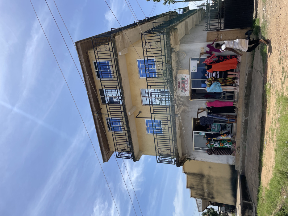 An outdoor, eye-level image depicts a three-story commercial and residential building under a bright blue sky with wispy clouds and visible contrails, located in Jos, Nigeria