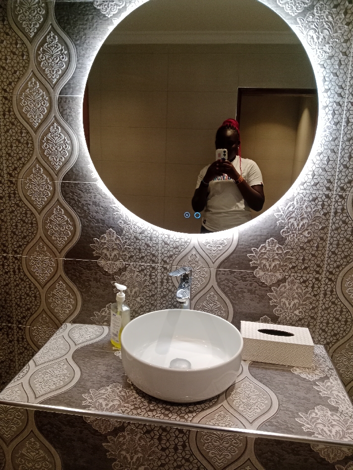 bathroom sink in a bathroom in Eldoret, Kenya, located at the coordinates 0.52 latitude and 35.268 longitude. The sink is white ceramic with a chrome faucet. It is situated on a counter with a gray and white patterned ceramic tile. There is a white soap dispenser bottle to the left of the sink, and a white rectangular tissue box to the right. The bathroom features decorative tile with an intricate pattern of overlapping swirls in light and dark shades of gray. A large round mirror with a lighted rim hangs on the wall above the sink. In the mirror, a person with short, red hair, a white shirt, and a black tank top is taking a selfie. The person is looking at their phone, which is in their right hand.