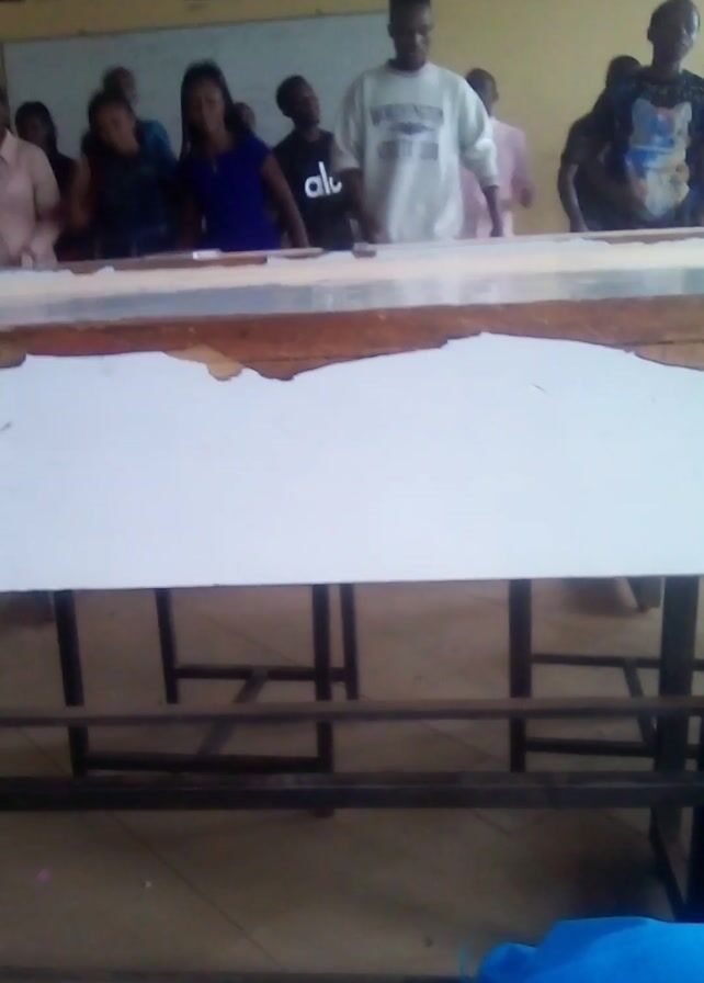 A low-angle indoor video shows several people in front of a wall, and the bottom of a desk and a person in blue clothing in the foreground. The video is oriented sideways, with the left side of the video at the top and the right side at the bottom. On the wall, a group of five to seven people is visible. Some are wearing casual clothes like t-shirts and a blue dress. The bottom of a white board is partially visible. To the right of the group, there is a dark desk and a person wearing blue. The camera appears to be stationary throughout the video.