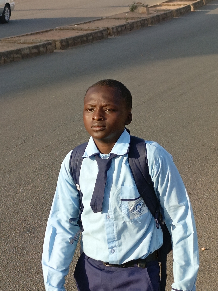 A young person, likely a student, stands on an asphalt road. They are wearing a blue school uniform with a tie and a backpack. The lighting suggests it is either early morning or late afternoon. In the background, a car is parked, and a concrete curb separates the road from an undefined area. The focus is on the individual's face, showing a neutral expression.