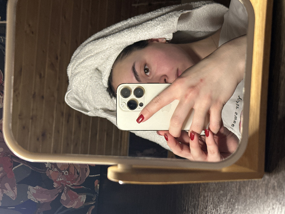 The image depicts a mirror selfie of a female subject indoors. The specific location within Базарово, Russia, is not identifiable from visual cues. The subject, viewed from the chest up, has a white towel wrapped around her head and wears a light-colored garment, the reflection of which shows inverted text. She holds a light-colored smartphone, equipped with a triple camera system, with both hands, positioning it to capture her reflection. The smartphone partially obscures the lower half of her face. Her fingernails are painted red. Her visible reflection shows part of her right eye and upper face, with some skin redness visible on her cheek. A small hoop earring is present in her visible right ear. The mirror has a rounded, light-colored wooden frame and rests on a dark, textured surface. The background visible in the mirror's reflection consists of a dark wall with a floral pattern featuring red and pink elements on the left, and horizontal light-brown wooden paneling on the right.
