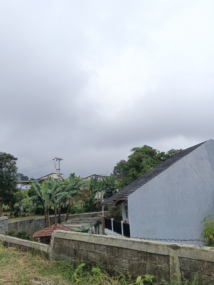 This image depicts a static outdoor scene in Kabiufa, Papua New Guinea, under a uniformly overcast, grey sky