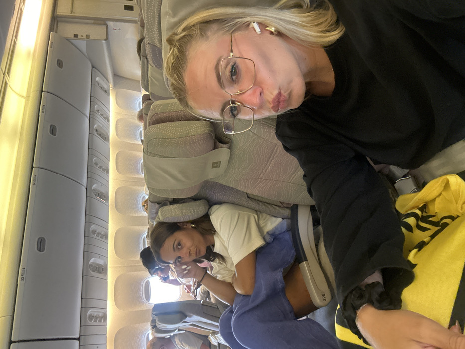 The image depicts the interior of a commercial aircraft cabin, specifically an economy or premium economy section. There is no visual information within the image to indicate its specific location within the city of Malé, Maldives. In the immediate foreground, a blonde-haired woman with hair pulled back and wearing large, square-rimmed glasses is posing with her lips puckered. She has a white wireless earbud in her right ear and is wearing small gold hoop earrings and a black long-sleeved top. A silver-colored bracelet is visible on her left wrist. Partially visible in the lower left, beneath her arm, is a yellow fabric item with black markings. To her left, a second woman with brown hair is seated in an aisle seat, identified by the visible "32E" on the seat back in front of her. She wears a white t-shirt and loose blue pants, looking towards the camera with a slight smirk. Her right hand is positioned near her chin, displaying white nail polish and a gold hoop earring is visible in her left ear. In the background, additional passengers occupy rows of seats. One male passenger in a white t-shirt is visible behind the second woman, and further back, another passenger appears to be speaking on a mobile phone near a window. The overhead bins above the seats display seat row numbers "33" and "34". The cabin is illuminated by overhead artificial lighting, and windows along the left side of the fuselage show a bright, indistinct exterior.