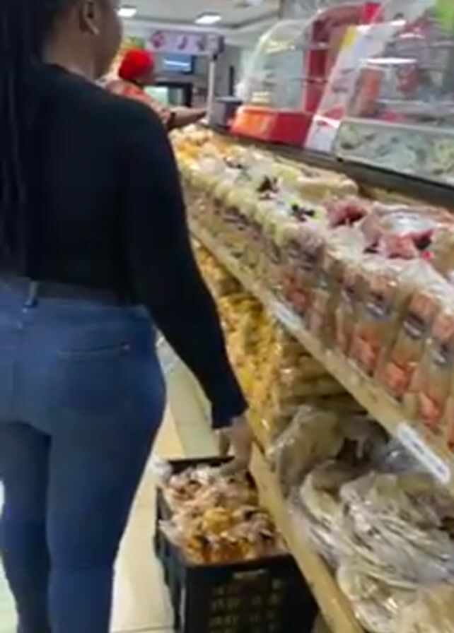 interior of a grocery store. In the first shot, a woman wearing a black top and jeans is putting bread loaves in a black crate. The next shot shows her walking down an aisle. Further down the aisle, a person in a military uniform is also walking. The aisle features shelves with various household and cleaning supplies such as buckets, mops, and stools.