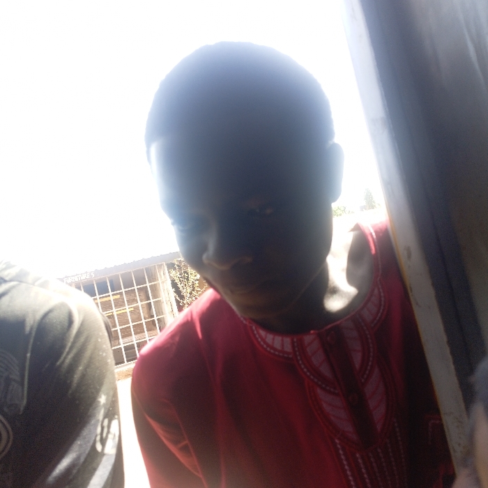 The image presents a heavily backlit outdoor scene, likely an urban or semi-urban environment in Jos, Nigeria. In the central foreground, a young individual is largely silhouetted against bright sunlight, their facial features obscured but their gaze directed generally forward and slightly downward. This individual wears a red tunic featuring white embroidered patterns around the collar and a partial button placket. To the left, the dark-clad shoulder and upper arm of a second person are partially visible. The background is significantly overexposed. A building structure is discernible, characterized by a corrugated metal roof and a window secured with a metal grid. Above this window, a partial sign reads "FURNITURE'S". Sparse green foliage is visible further in the distance to the right of the building. A dark, vertical structural element occupies the far right edge of the frame. The strong backlighting indicates a sunny outdoor setting. The precise location within Jos, Nigeria, beyond proximity to a "FURNITURE'S" business, cannot be identified from the visual evidence.