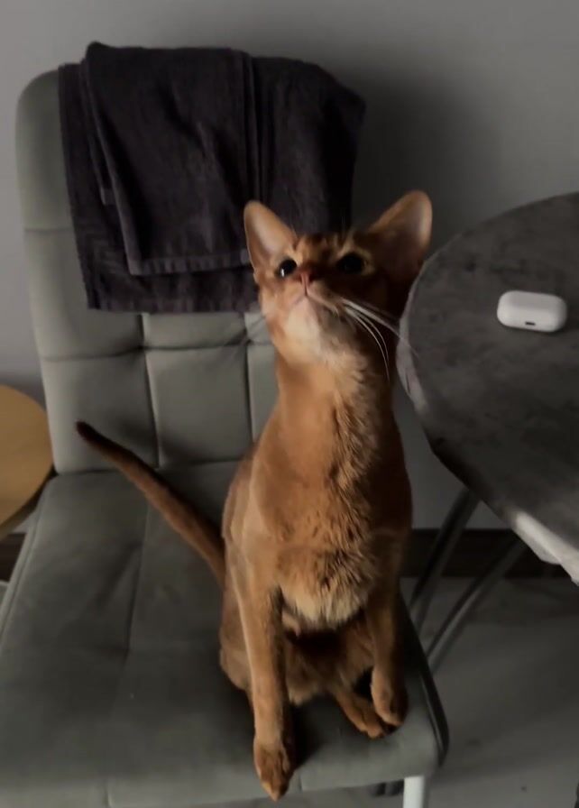 A medium shot captures an Abyssinian cat sitting upright on a grey chair, its gaze directed upwards