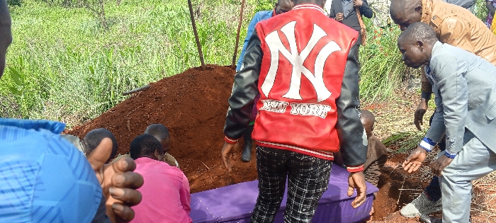 The image depicts a graveside scene in Namisha, Democratic Republic of the Congo