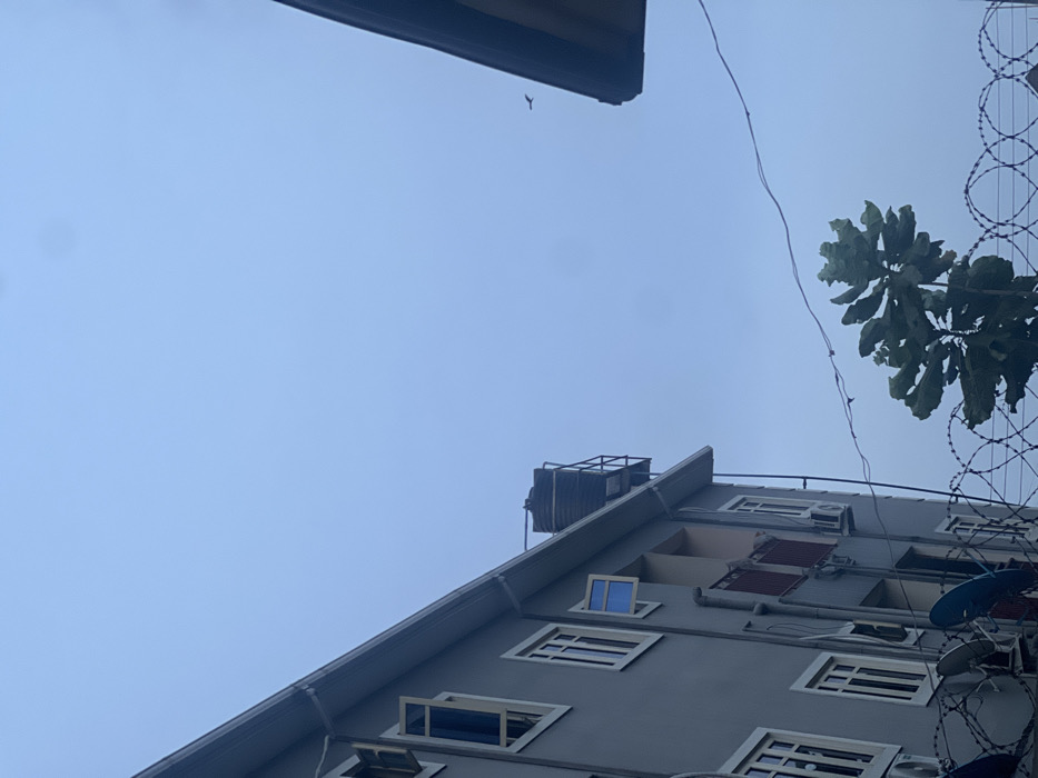 A low-angle shot reveals a tall, gray building with multiple windows. Some windows are open, revealing glimpses of interior colors. A water tank sits atop the roof. Barbed wire lines the right edge. A tree branch extends into the frame from the upper right. Wires crisscross the sky. A small bird is visible near the top center under a dark overhang, against a overcast, gray sky.