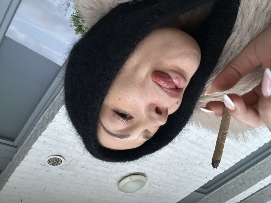 A woman with light skin, wearing a black hooded knit hat and a fur-trimmed coat, sticks out her tongue. She is photographed from a low angle, tilting her head downward. Her right hand holds a lit, rolled cigarette or joint. The background includes a white brick ceiling with two light fixtures and a glimpse of a window. The nails of her fingers are light pink with white tips.