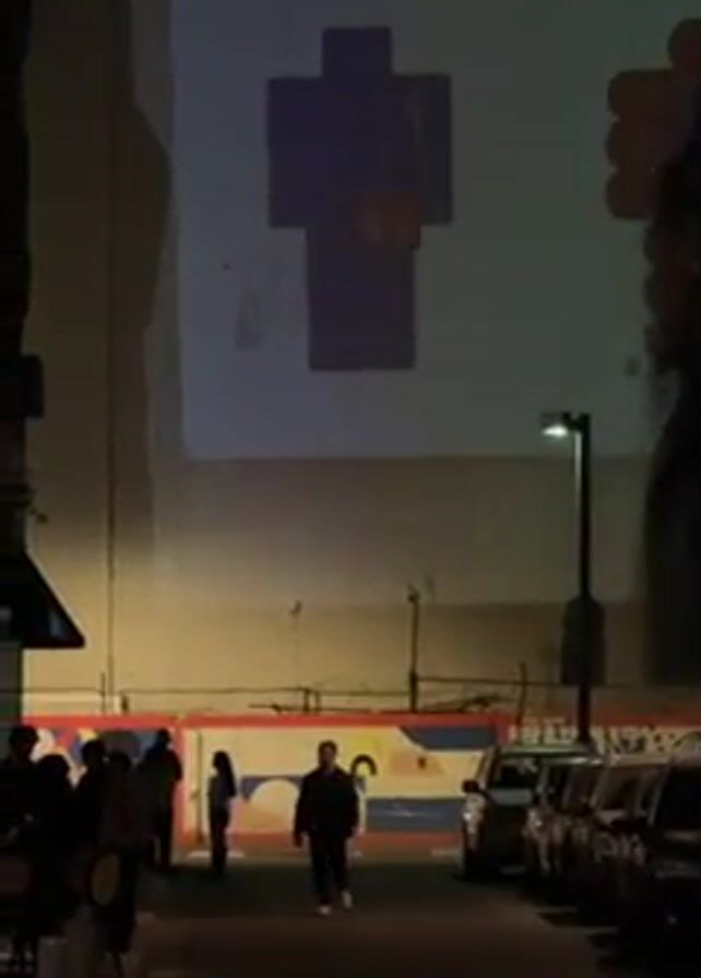 The video depicts a city street at night. A group of people is gathered on the left side of the street near what appears to be a building with a dark awning. A man in dark clothing is walking down the center of the street towards the camera. Several cars are parked on the right side of the street. A street light is visible on the right. A large projection of colorful, abstract shapes and figures is displayed on the wall of a building at the end of the street.