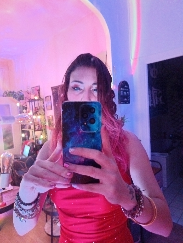 A woman with pink-tipped hair takes a selfie, obscuring her face with a phone displaying a cosmic design. She wears a red dress and several bracelets on both wrists. The background features a room bathed in pink and purple lighting, with decorative elements like shelves with plants and objects, and a door frame with colorful lights above. A black, decorative wall hanging is visible to the right.