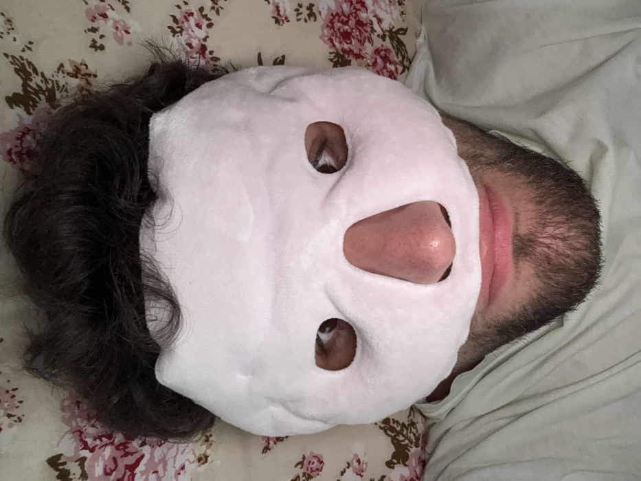 A close-up, top-down photograph depicts an individual lying supine. The individual's face is mostly covered by a white, soft-textured facial mask, featuring cutouts for the eyes and nose. Brown eyes are visible through the eye holes, and a nose with a slightly reddened tip protrudes through its opening. Dark, curly hair is visible above the mask, and dark stubble or a short beard covers the chin and jawline below the mask. The individual wears a light-colored, possibly pale green, crew-neck shirt. The background consists of a bedsheet or pillowcase with a floral pattern, displaying red/pink flowers and dark green foliage on an off-white or beige fabric. The specific location within Tel Aviv, Israel, cannot be ascertained from the visual evidence presented in the image.