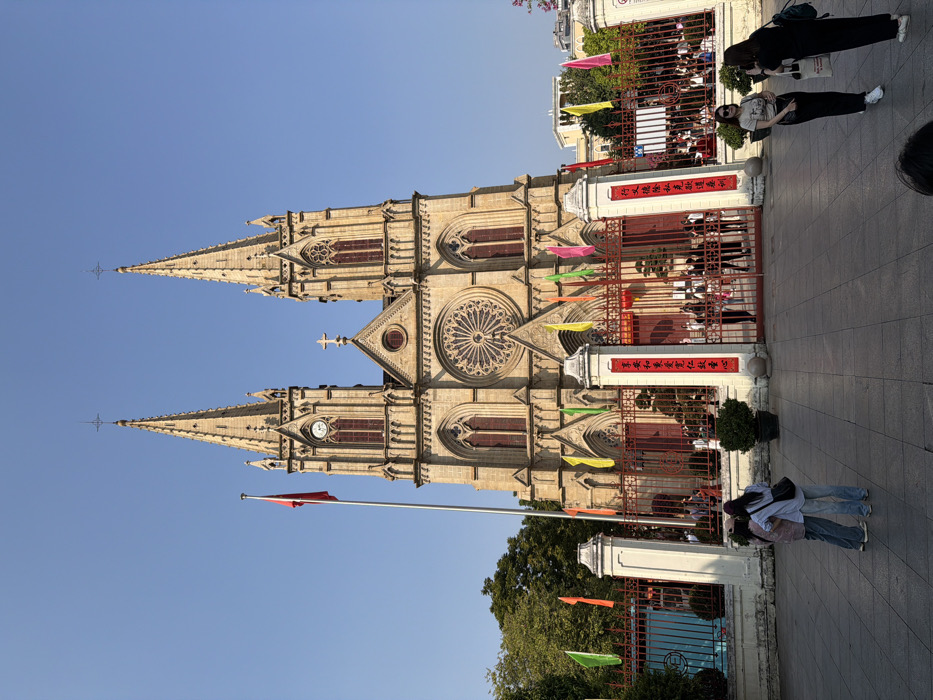 A tall, ornate church with two spires dominates the scene. The facade features intricate detailing, a large rose window, and a clock on one of the towers. A metal fence surrounds the church, decorated with colorful pennants. People are gathered near the fence, some taking photos. A flag pole stands prominently in front of the church. The sky is a clear blue, and some trees are visible in the lower part of the image.