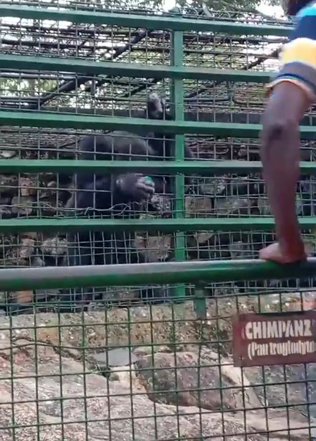A man in a blue and white striped shirt stands beside a chimpanzee enclosure at a zoo. The enclosure is made of green metal bars, and a sign indicates that it houses chimpanzees. The chimpanzee sits within the enclosure, and the surrounding environment appears to be a park-like setting with greenery visible in the background.