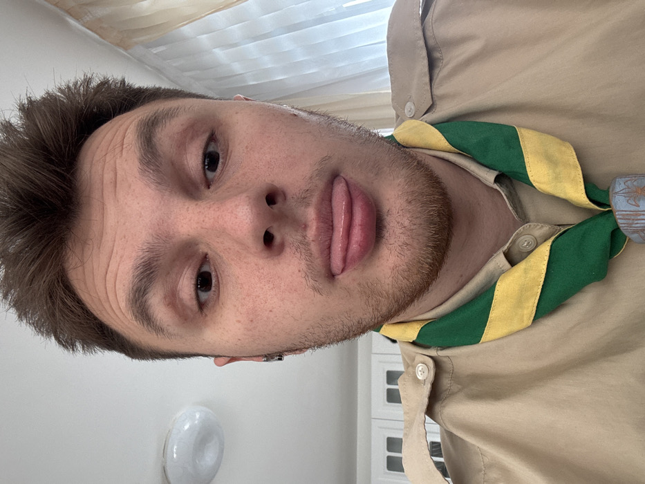 This is a close-up, chest-level portrait of a male individual, aged approximately 20-30 years, in an indoor setting within the city of Kaloyanovo, Bulgaria. The subject has short brown hair, stubble on his chin and upper lip, and visible freckles across his nose and cheeks. He is looking directly into the camera with his tongue extended. He wears a tan or khaki collared shirt, likely a uniform, with visible buttons on the shoulders. Around his neck is a neckerchief, predominantly green with yellow diagonal stripes, secured by a light-colored woggle featuring an embossed emblem, possibly a fleur-de-lis. An earring is visible in his left ear. The background on the left reveals a white ceiling, a white dome-shaped light fixture, and white cabinetry. On the right, a pleated, light-colored curtain is partially visible.