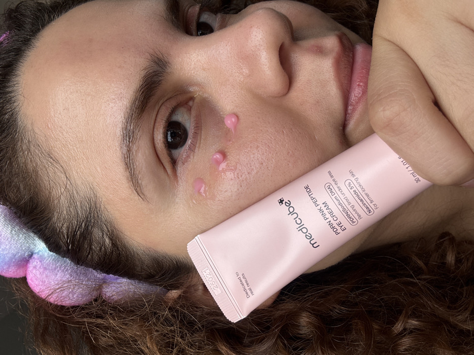 A close-up photograph captures an individual, likely female, with medium-toned skin and dark curly hair, wearing a multi-colored pastel plush headband. The subject's right eye is open and looking forward. Four distinct, spherical drops of a translucent pink product are visible on the skin directly beneath the right eye, with a fifth, larger, spread application near the outer corner. The individual's right hand holds a light pink tube of "medicube+ PDRN PINK PEPTIDE EYE CREAM." Visible text on the tube includes "PDRN(Sodium DNA)," "Reviving tired under-eye area," "Niacinamide 5%," "For firmer-looking skin," and "30 ml / 1.01 fl. oz." A batch code "25021" is printed near the tube's crimped top. The background is a non-descript, dark, blurred surface, indicating an indoor environment. There are no visual cues present in the image to establish a specific location within the city of Columbus, United States of America.