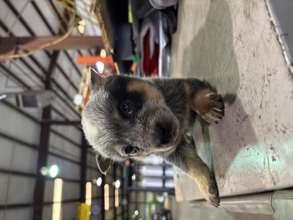 - "A very young Australian Cattle Dog puppy with blue merle coloring rests on a metal surface" by FM-jc1Mt1, licensed under CC BY 4.0
