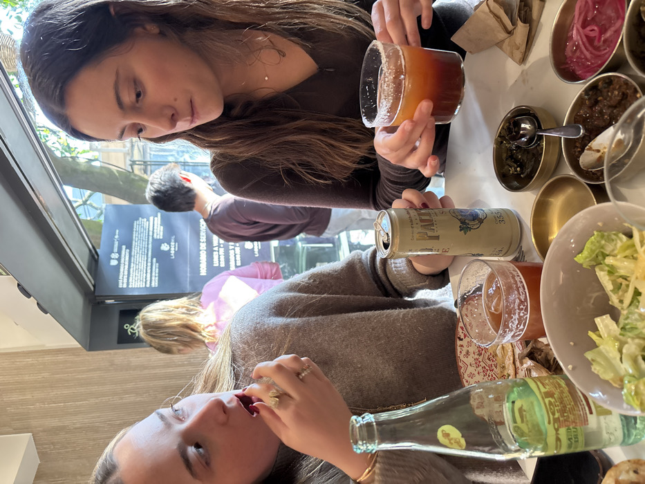 Two women sit at a restaurant table, surrounded by food and drinks. One woman holds a glass with a salted rim and amber liquid. Nearby, a can of "PALE" beer and an empty green bottle are visible. Several small dishes containing pickled onions, sauces, and relish are arranged on the table. One woman is looking at the glass she is holding while the other woman is facing down. A partial plate of salad sits to the right. Other patrons are visible in the background.