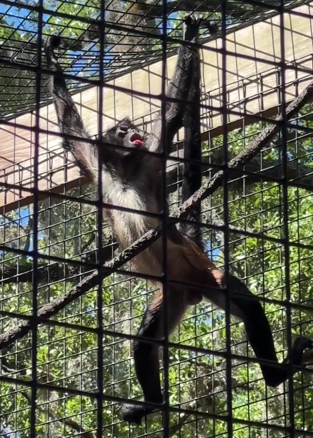 A spider monkey hangs from the wire grid of its enclosure at an outdoor zoo