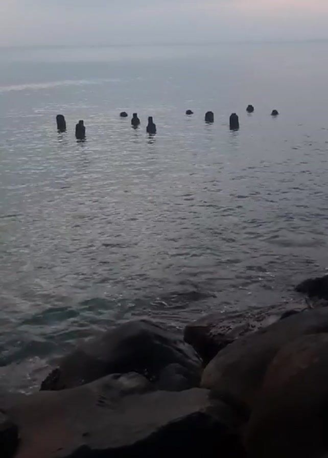 The scene is a view of a calm body of water, possibly a sea or large lake, under a pale sky. Several dark, wooden posts or pilings stick up from the water at varying heights. In the foreground, large, dark rocks form a breakwater or natural shore. Gentle waves lap against the rocks, causing small splashes. The water's surface is rippled, reflecting the ambient light, while the background sky is a soft gradient of blues and greys.