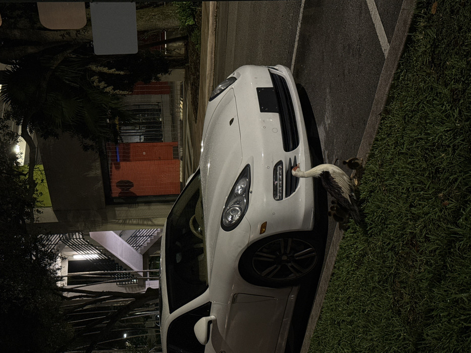 This nighttime scene is located in the city of Coral Gables, United States. A white Porsche Panamera (likely 970 generation) is parked on a dark asphalt surface with faint white parking lines. The vehicle exhibits visible water droplets on its hood and roof, and its front headlights are illuminated. A black rectangular area covers the front license plate position. On the adjacent green grass verge, separated by a concrete curb, an adult Muscovy duck, displaying white and dark plumage with red facial caruncles, is stationary. Approximately six to eight small, dark-colored ducklings are clustered closely around the adult duck on the grass. In the background, an urban building features an illuminated exterior concrete staircase with metal railings on the left, and a large red corrugated metal door or shutter on the right. Trees with dark foliage and an obscured rectangular street sign are also present, illuminated by artificial light sources. No human figures are visible.